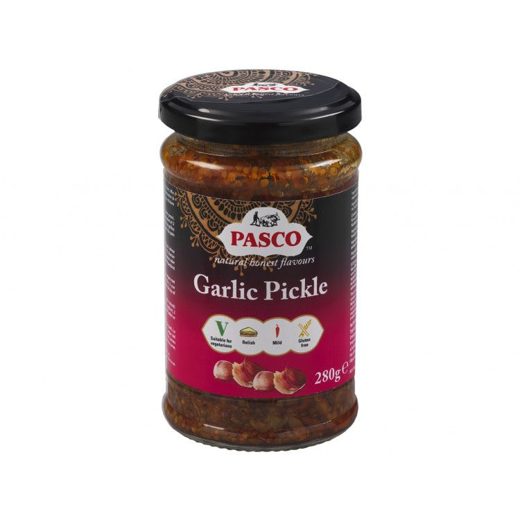 Pasco Marynowany Czosnek to popularny indyjski specjał, który składa się z umiarkowanie gorącej, dojrzewającej w słońcu indyjskiej papryki chilli i pikantnego czosnku. Używaj marynowanego czosnku Pasco do dań głównych lub jako dip z naan lub pappadamus.