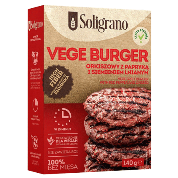 Vege Burger Orkiszowo-Paprykowy z Siemieniem Lnianym wegetariański wegański Soligrano 140 g