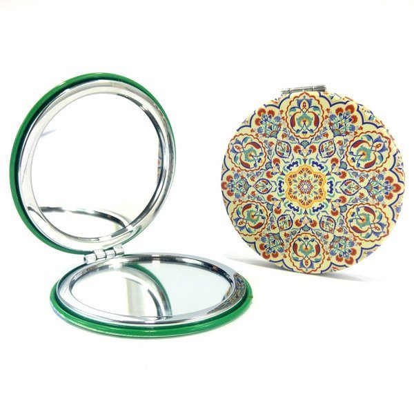 Niezbędne w każdej torebce bądź kosmetyczce. Posiada lekkie magnetyczne zapięcie. W środku znajdują się dwa lusterka jedne powiększające 2x drugie klasyczne. Okrągłe ze wzorem mandali.