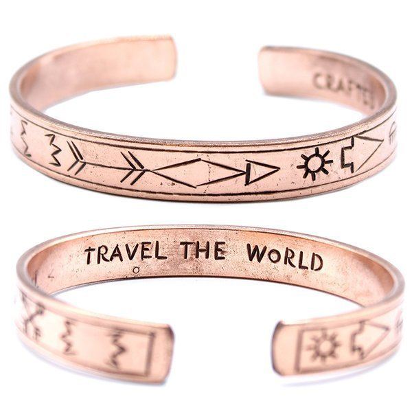 Inspirująca bransoletka z miedzi z wygrawerowanym napisem Travel the world.