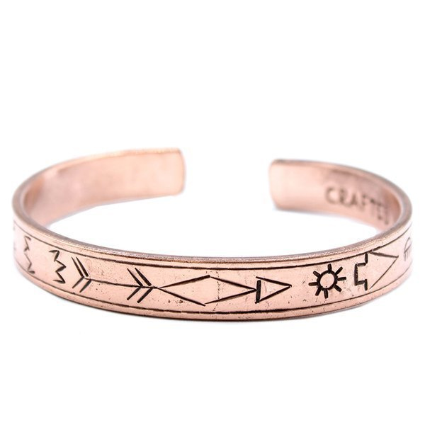• Miedziana inspirująca bransoletka z grawerem słońca i strzał.