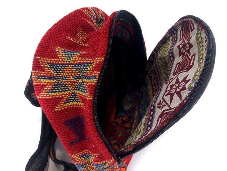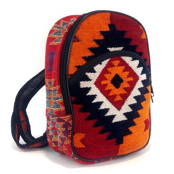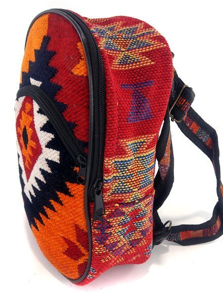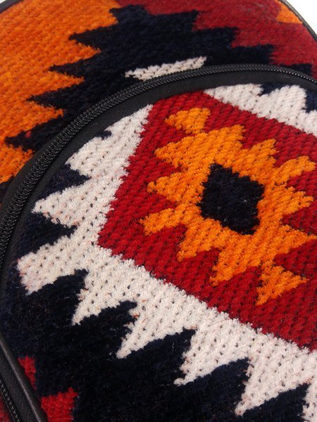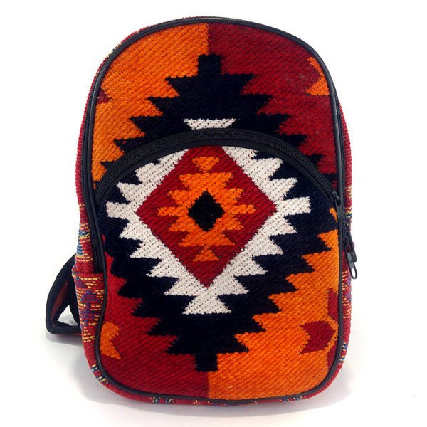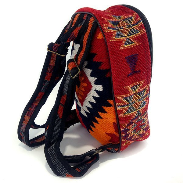 Niezwykle oryginalny turecki plecak wykonany z miękkiego, miłego w dotyku materiału kilimowego, jakim jest kilim anatolijski. Plecak w kolorze pomarańczowo-czerwonym w orientalne wzory.