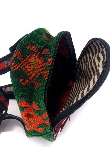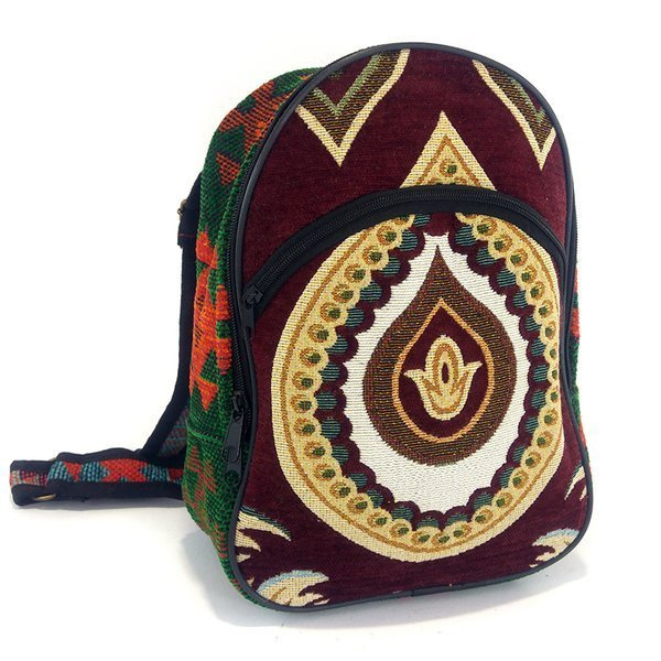 Niezwykle oryginalny turecki plecak wykonany z miękkiego, miłego w dotyku materiału kilimowego, jakim jest kilim anatolijski. Plecak w kolorze bordowym w orientalne wzory z kwiatem lotosu w centrum.