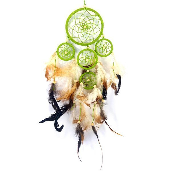 Zielony łapacz snów zdobiony biało-brązowo-czarnymi piórami, drewnianymi koralikami, zaplatany bawełnianą nicią.