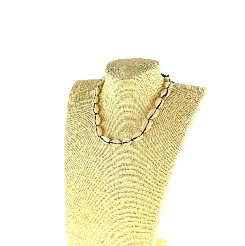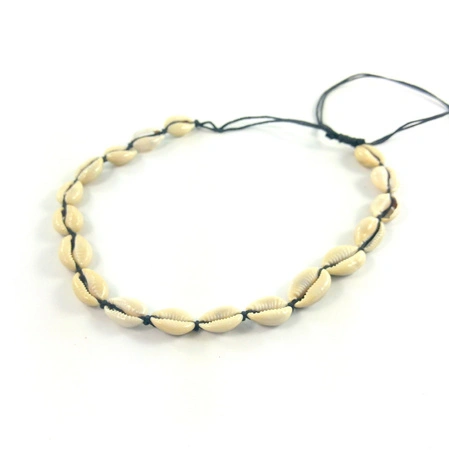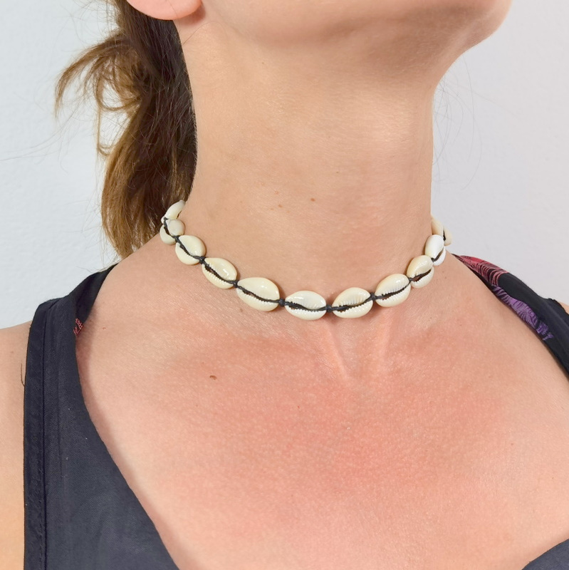 Naturalny naszyjnik z muszelek kauri na czarnym sznurku. To wyjątkowy dodatek dla kobiet zarówno na co dzień, jak i wyjątkowe okazje. Nada strojowi nietuzinkowego, środziemnomorskiego klimatu.