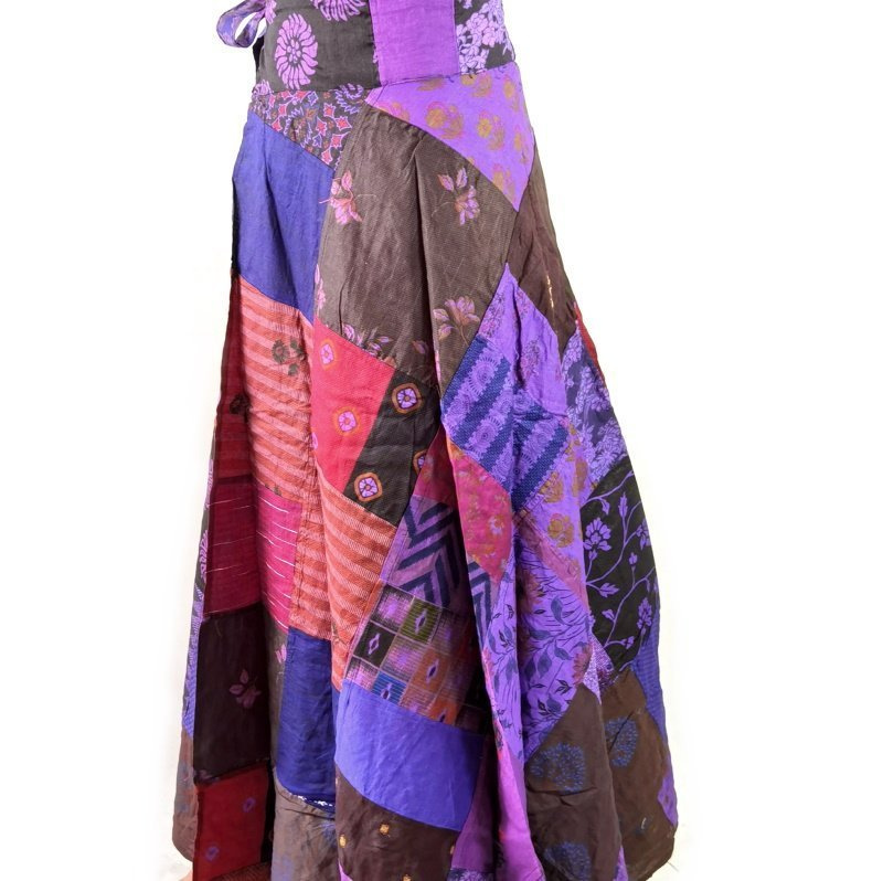 Orientalna długa spódnica wiązana w kolorze fioletowym. Uszyta z bawełny metodą patchworkową w Indiach.