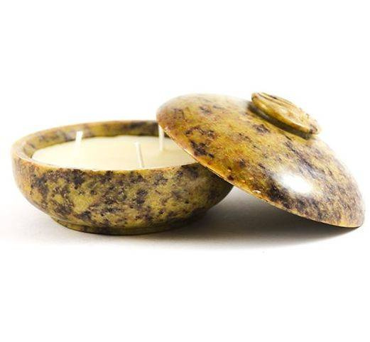 Do czystego wosku dodano naturalne olejki zapachowe dzięki czemu uzyskano pięknie pachnącą świecę zamkniętą w kamiennej szkatułce.