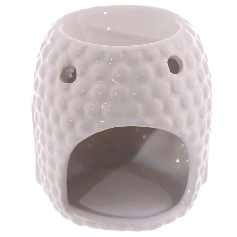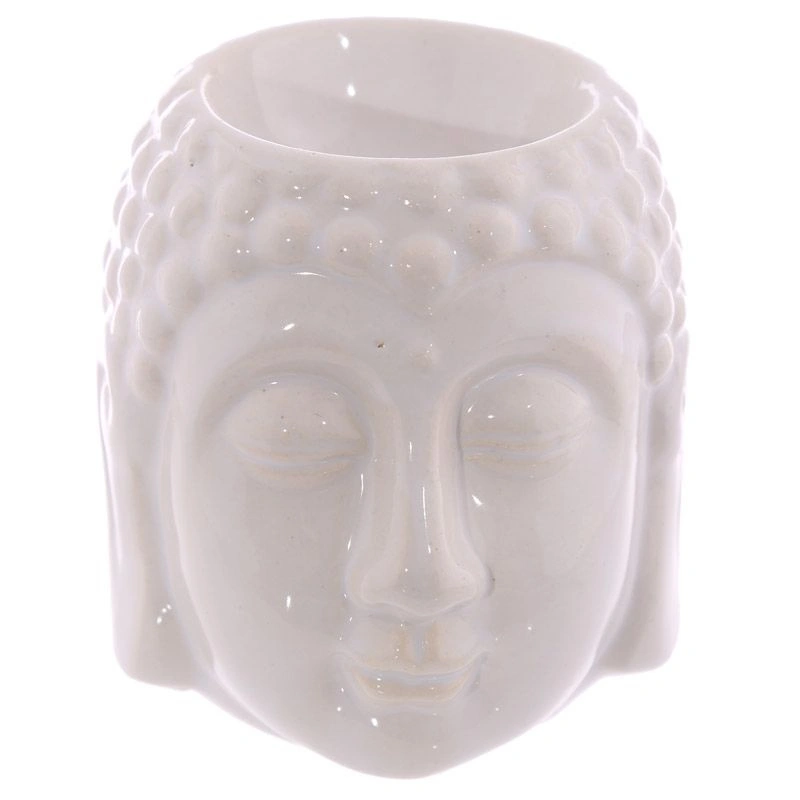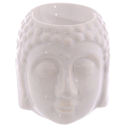 Ceramiczny kominek w kolorze białym, na olejek zapachowy w kształcie głowy Buddy, postarzany świetnie sprawdza się w aplikacji olejków i wosków.