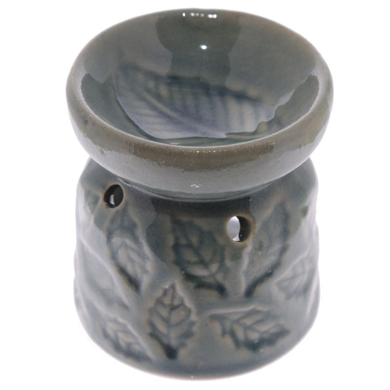 Ceramiczny kominek w kolorze niebieskim, na olejek zapachowy z motywem małych liści, świetnie sprawdza się w aplikacji olejków i wosków.