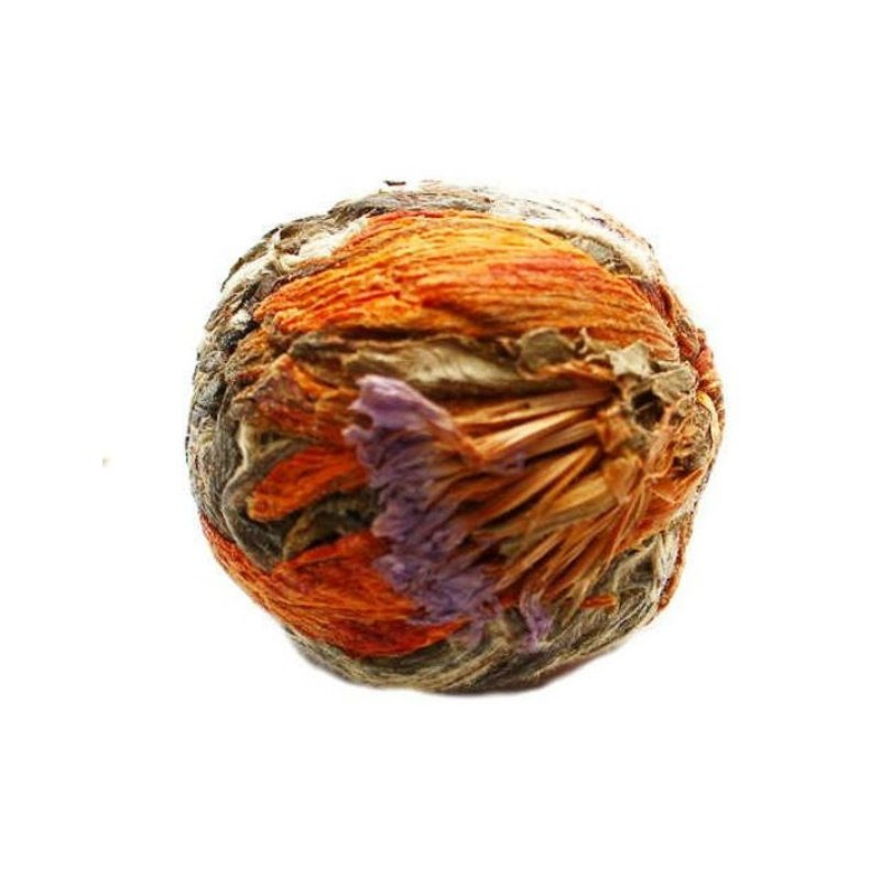 Liście zielonej herbaty, pomarańczowy kwiat lili, fioletowy kwiat fiołka - misternie splecione w dużą, zieloną kulę. Po zalaniu wodą możemy podziwiać wspaniałe widowisko, którego sceną stanie się nasza filiżanka. Prawdziwa uczta nie tylko dla podniebienia, ale również dla oka!