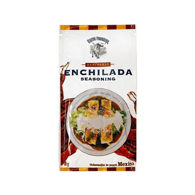 Przyprawa do Enchilady w saszetce. Enchilada to potrawa z dwóch złączonych ze sobą tortilli, nadziewana mięsem lub warzywami i polana sosem. Może być także posypana startym serem.