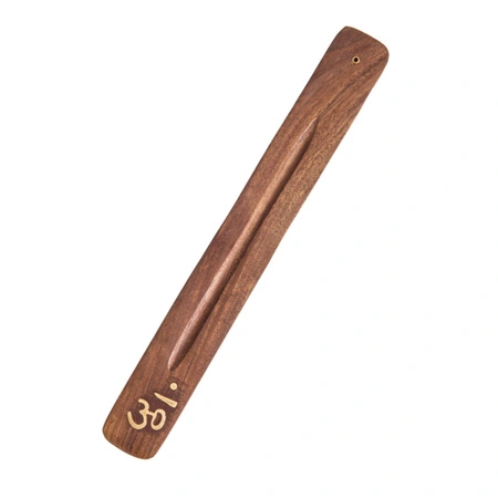 Prosty, delikatny stojak na kadzidła. Wykonany z drewna egzotycznego, z symbolem Om. Posiada zagłębienie na opadający z kadzidełka popiół. Nieodłączny element każdego fana kadzidełek.