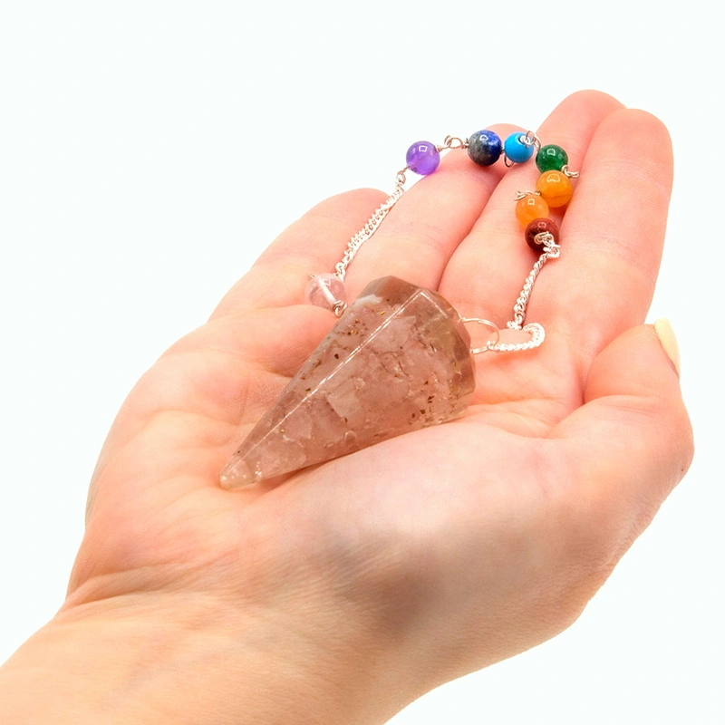 Orgonit został uformowany w klasyczny kształt wahadła oraz zawieszony na łańcuszku z minerałami dopasowanymi barwami do 7 czakr.