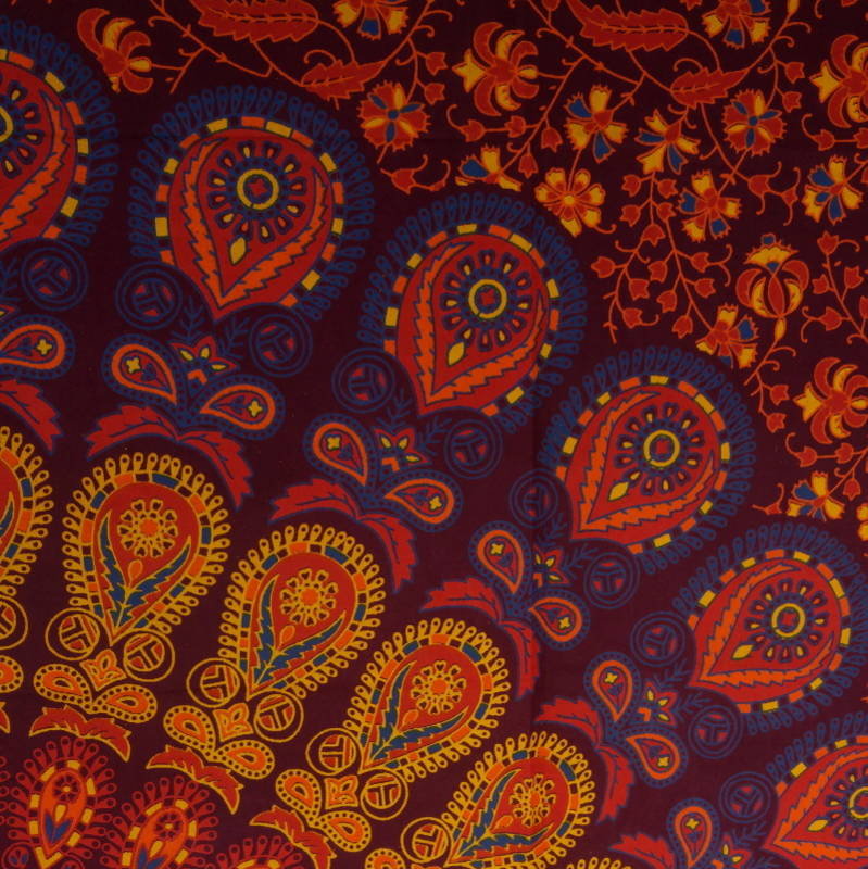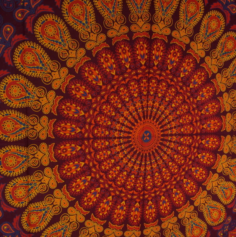 Przepiękna narzuta z Indii wykonana z bawełnianego płótna w kolorach bordowym i pomarańczowym. Zdobiona jednostronnie naniesionymi metodą batiku wzorami (mandala). Idealna jako kapa na łóżko, także jako obrus, zasłona oraz tkanina dekoracyjna do powieszenia na ścianie.