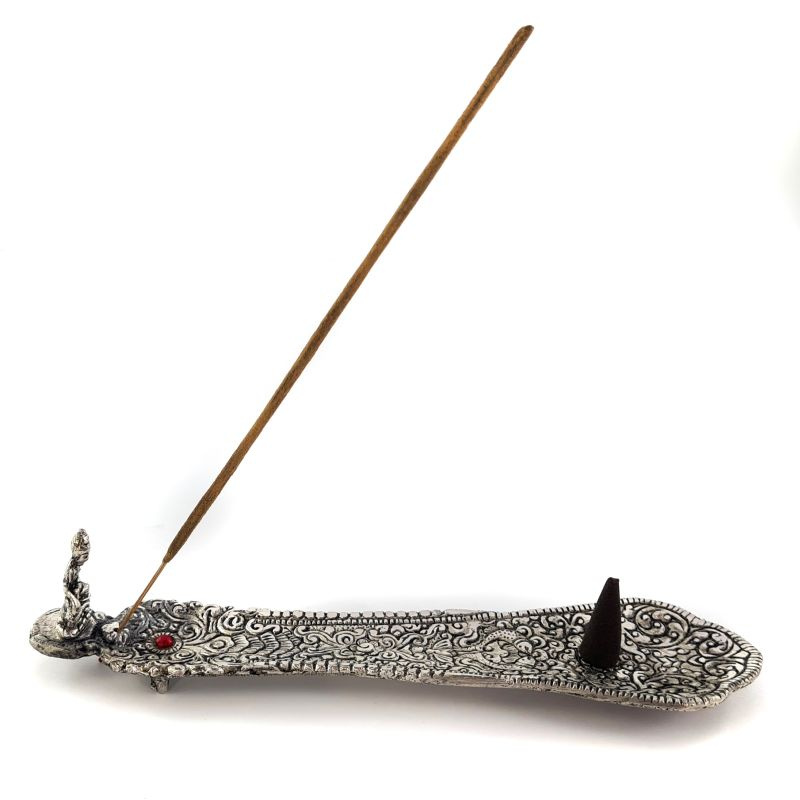 Posiada zagłębienie na opadający z kadzidełka popiół oraz ozdobny kryształek .