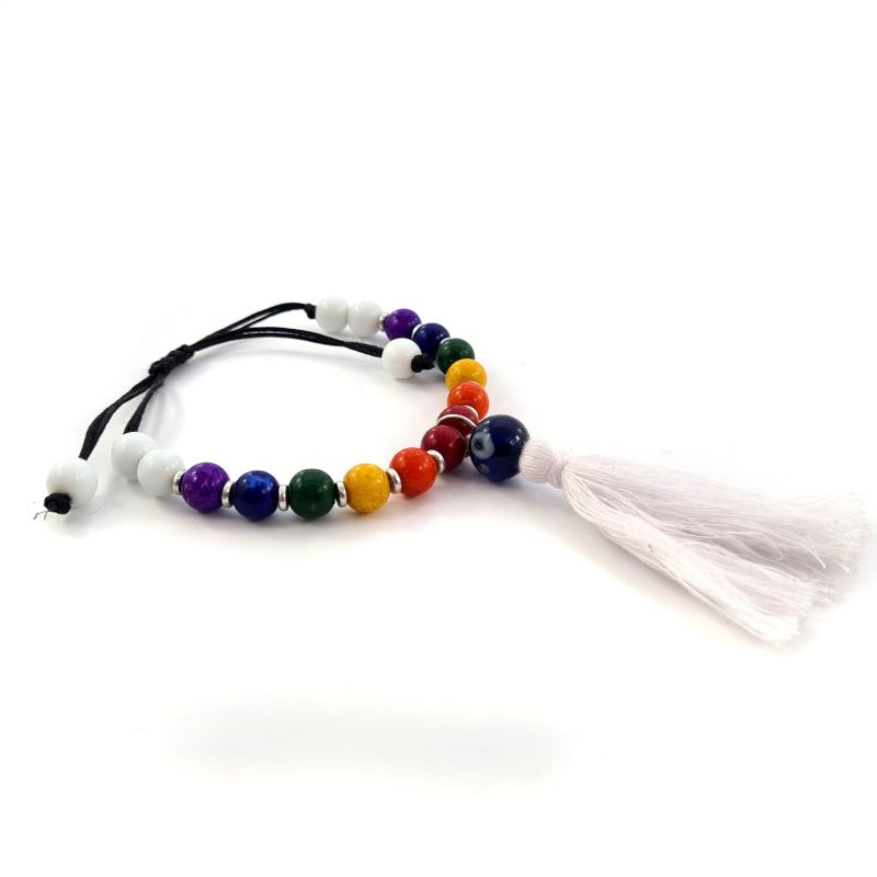 - Regulowana bransoletka na sznurkue, kolorowe koraliki czakry i ozdobny pompon. Orientalna biżuteria nadająca wyjątkowego tonu Twojemu ubiorowi.