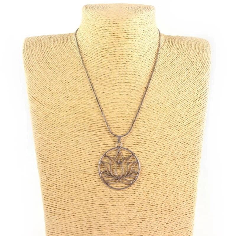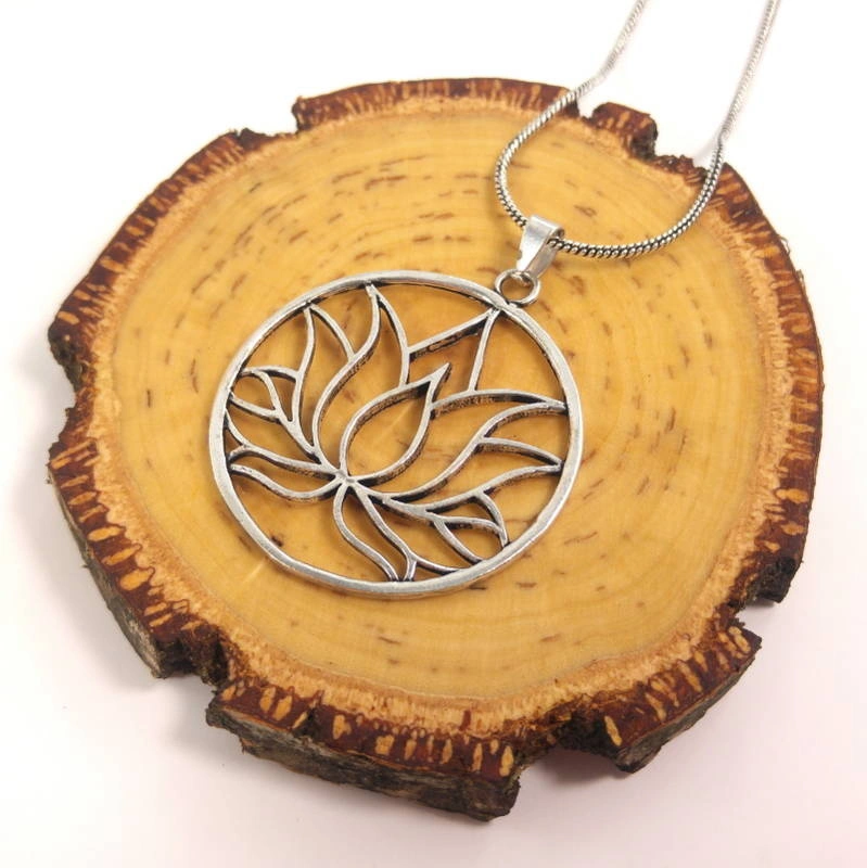 Metalowy naszyjnik w kolorze srebrnym z symbolem kwiatu lotosu, na metalowym łańcuszku. Kwiat lotosu - stanowi jeden z ośmiu pomyślnych znaków Buddyzmu Symbol lotosu w buddyzmie jest stosowany od tysięcy lat – symbolizuje on czystość, oświecenie, i potencjał.