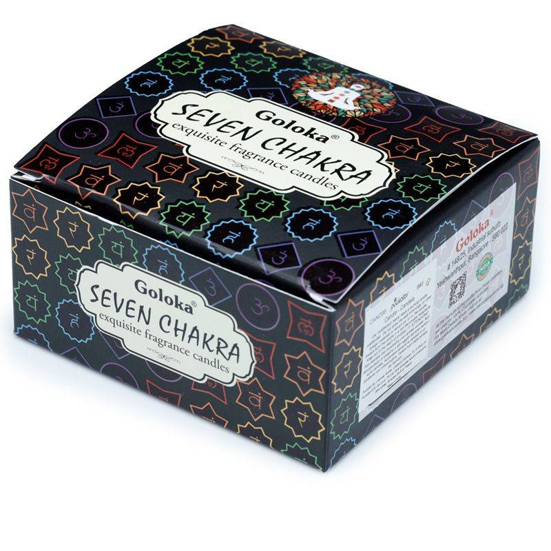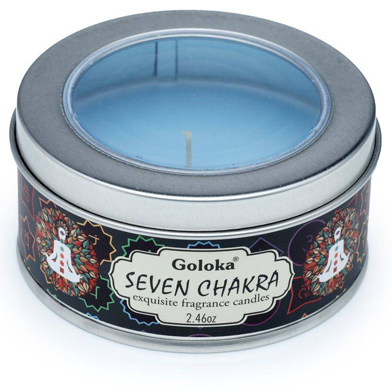 Świeca woskowa w puszce o zapachu siedmiu czakr (seven chakra) firmy Goloka. W metalowym pudełku z pokrywką, wygodna do zabrania ze sobą w ulubione miejsca!