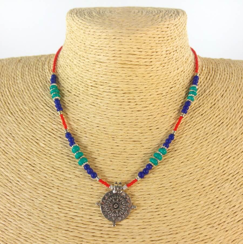 Naszyjnik mandala (niebieskie i czerwone koraliki, orient)
