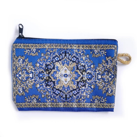 Orientalna saszetka z Turcji kolorowa ze złotym wzorem. Zapinana na zamek błyskawiczny. Środek saszetki podszyty tkaniną. Idealna na co dzień jako mała podręczna kosmetyczka, portfel lub etui na dokumenty.