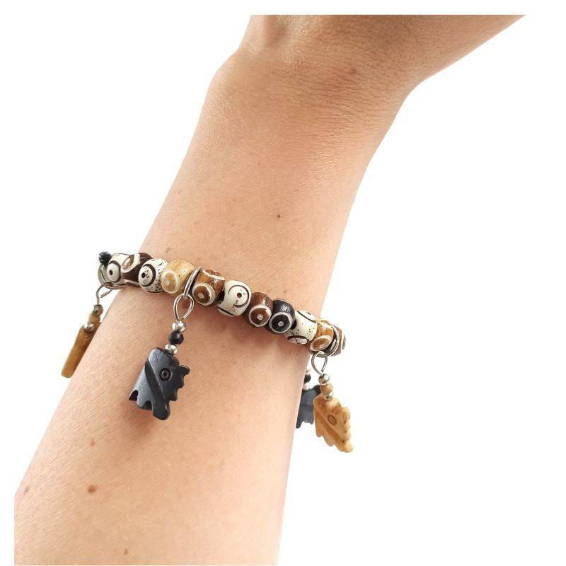 - Beżowa bransoletka na gumce, z rzeźbionymi koralikami i słoniami z kości słoniowej. Ciekawe uzupełnienie stylizacji.