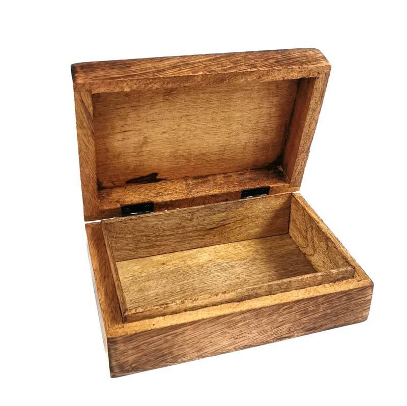 - Drewniana rzeźbiona szkatułka z Indii, wykonana ręcznie. Na wieku wyrzeźbiony motyw kwiatów.