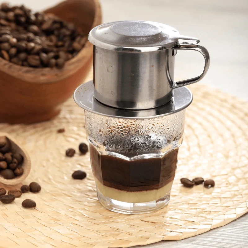 W dokładnie takich zaparzaczach serwuje się kawę w wietnamskich kawiarniach. Składa się z czterech elementów (talerzyk-podstawka, sitko, kubeczek, pokrywka). Możliwość regulacji  intensywności smaku. Przygotowana kawa za pomocą zaparzacza posiada niepowtarzalny aromat i smak.