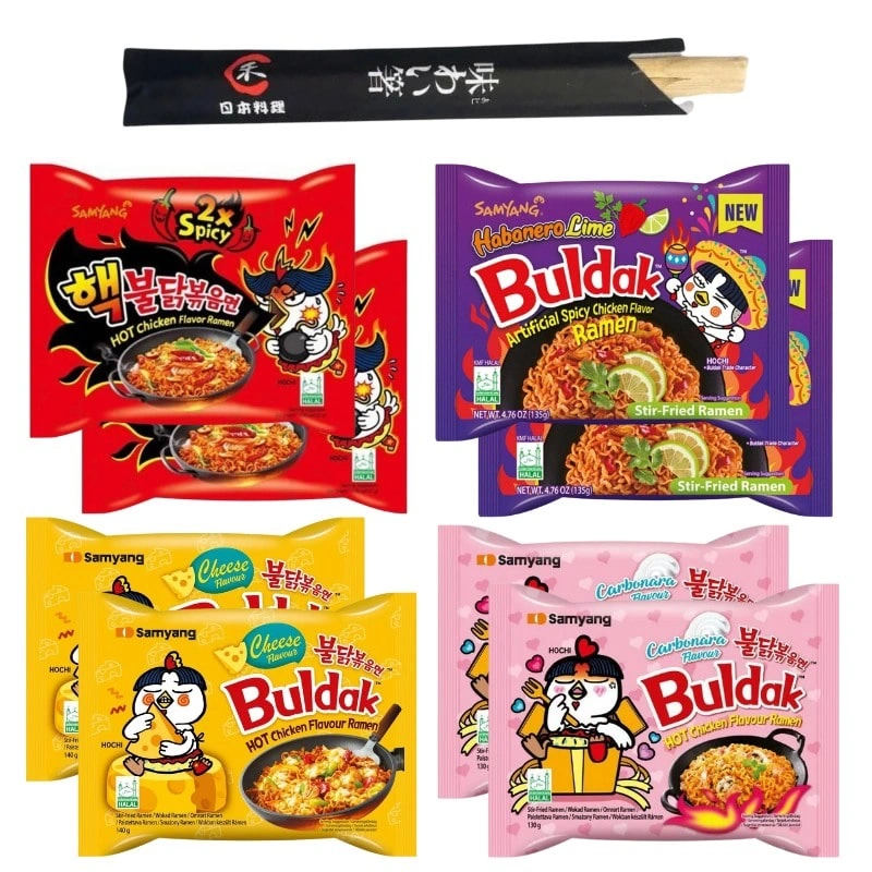 - Zestaw bardzo ostrych zupek Buldak: Carbonara, 2x Spicy, Habanero Lime, Cheese. Obowiązkowa pozycja dla miłośników ostrych smaków, sera i zupy ramen. 8 par pałeczek bambusowych GRATIS.