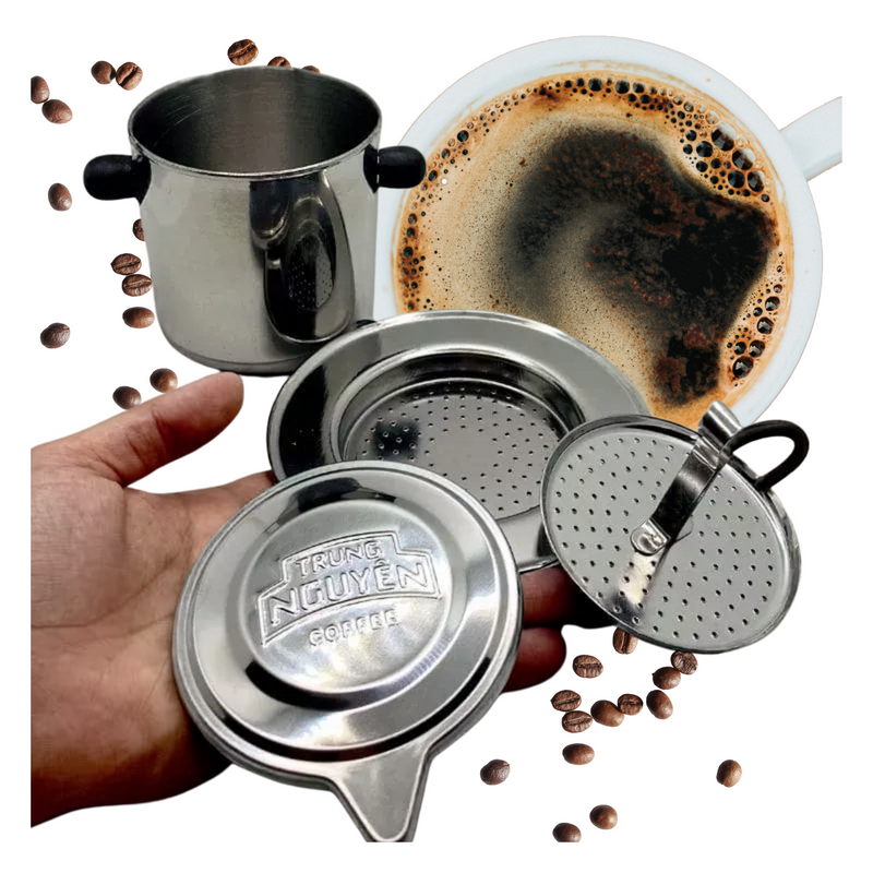 Zestaw do kawy po wietnamsku zawiera wyjątkowy zaparzacz Phin, do tradycyjnego sposobu przygotowywania kawy po wietnamsku. To niepozorne urządzenie umożliwia powolne i precyzyjne parzenie kawy, co przekłada się na głęboki smak kawy i aromatyczne doznania.