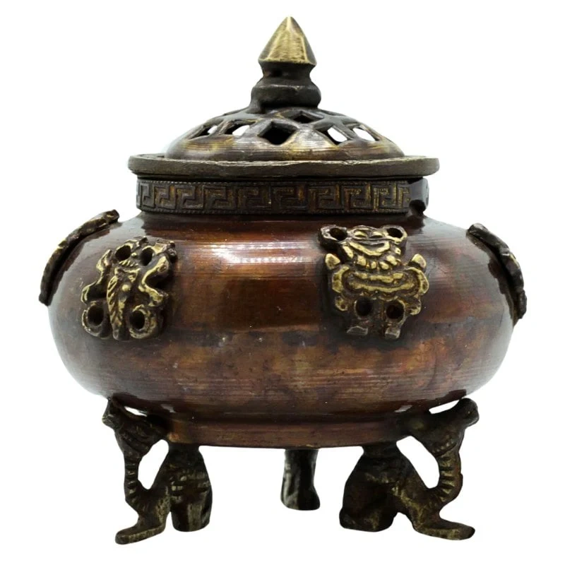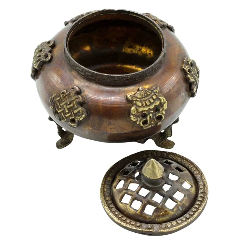 - Oryginalna tybetańska kadzielnica wykonana z mosiądzu, z sześcioma symbolami buddyjskimi.