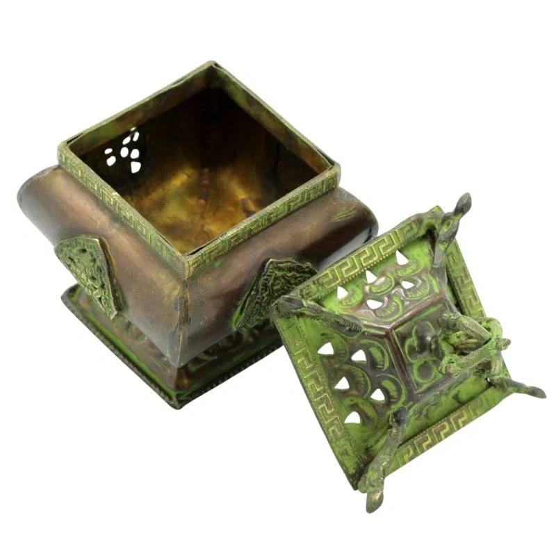 - Oryginalna tybetańska kadzielnica wykonana z mosiądzu, z czterema symbolami buddyjskimi.