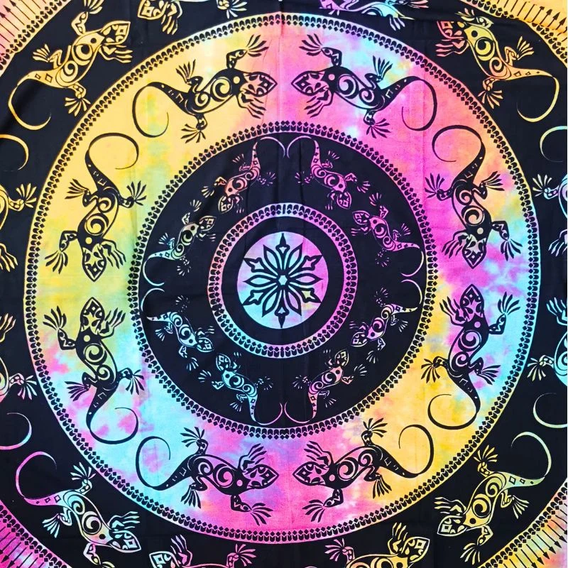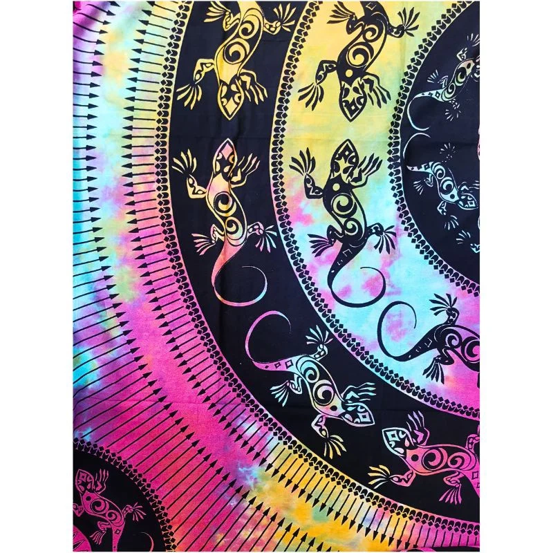 • Przepiękna narzuta z Indii wykonana z bawełnianego płótna. Zdobiona jednostronnie naniesionymi metodą batiku wzorami, z motywem jaszczurek.