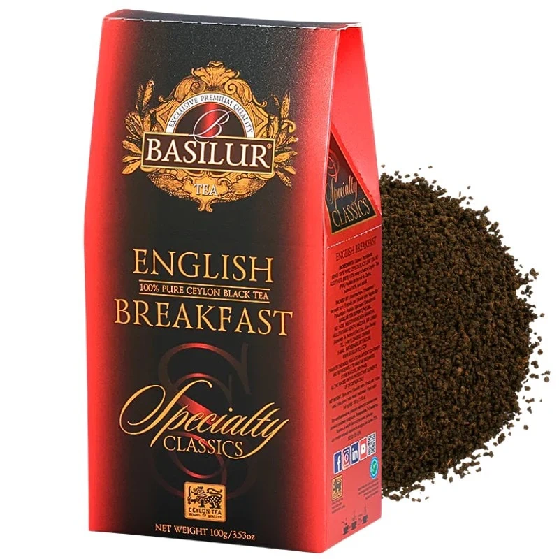 - Klasyczna czarna herbata cejlońska English Breakfast Basilur. To herbata o wyjatkowo bogatym smaku, do jej produkcji zebrano liście czarnej herbaty z Cejlonu, z najlepszych plantacji.