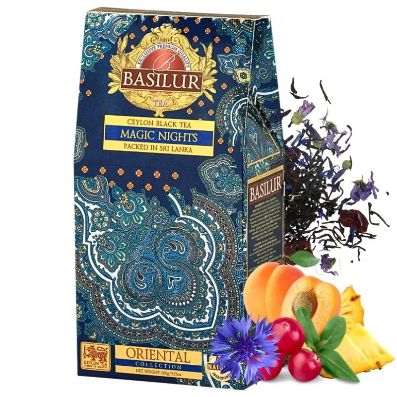 Czarna herbata cejlońska Magic Nights Basilur o owocowym aromacie skomponowana z liści najwyższej jakości. Herbaty Basilur charakteryzują się niepowtarzalnym smakiem, dzięki bardzo dobrym warunkom uprawy herbaty.