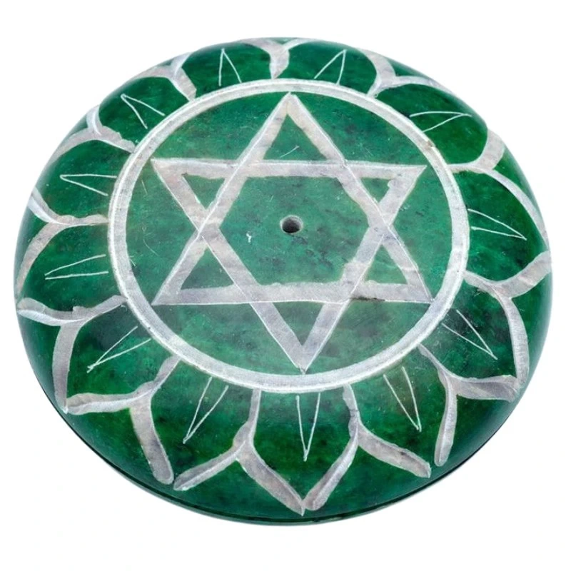 • Wyjątkowa podstawka pod kadzidła z trwałego kamienia - steatytu z symbolem czwartej czakry.