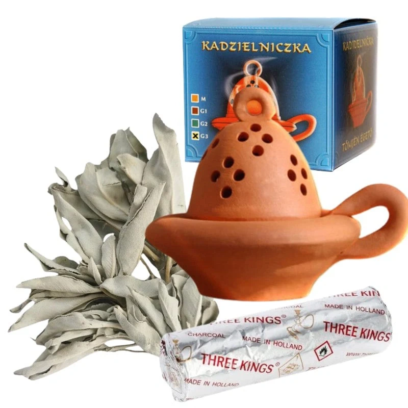 Zestaw do palenia kadzidła biała szałwia, kadzielniczka, węgielki