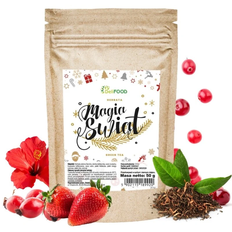 Zielona herbata liściasta sencha Magia Świąt z owocami i hibiskusem, Deli Food 50g