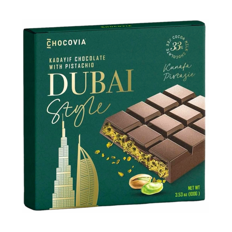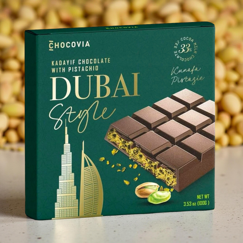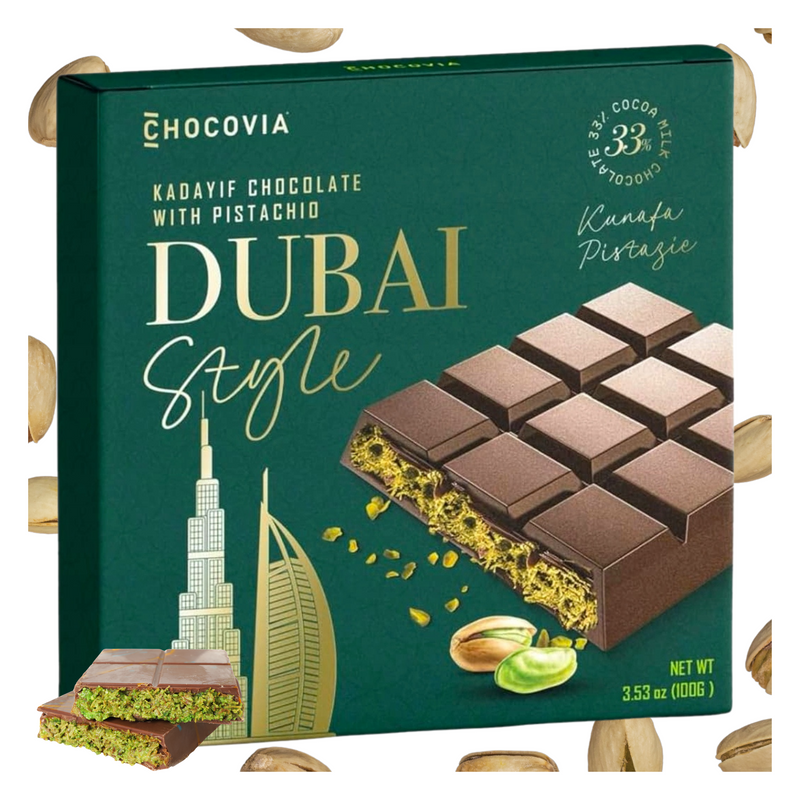 Każdy kęs czekolady dubajskiej Chocovia Kadaif z Pistacjami to prawdziwa uczta dla podniebienia.