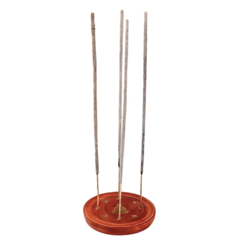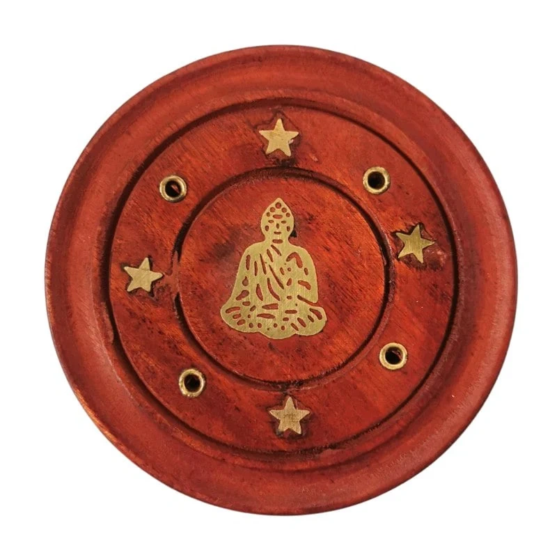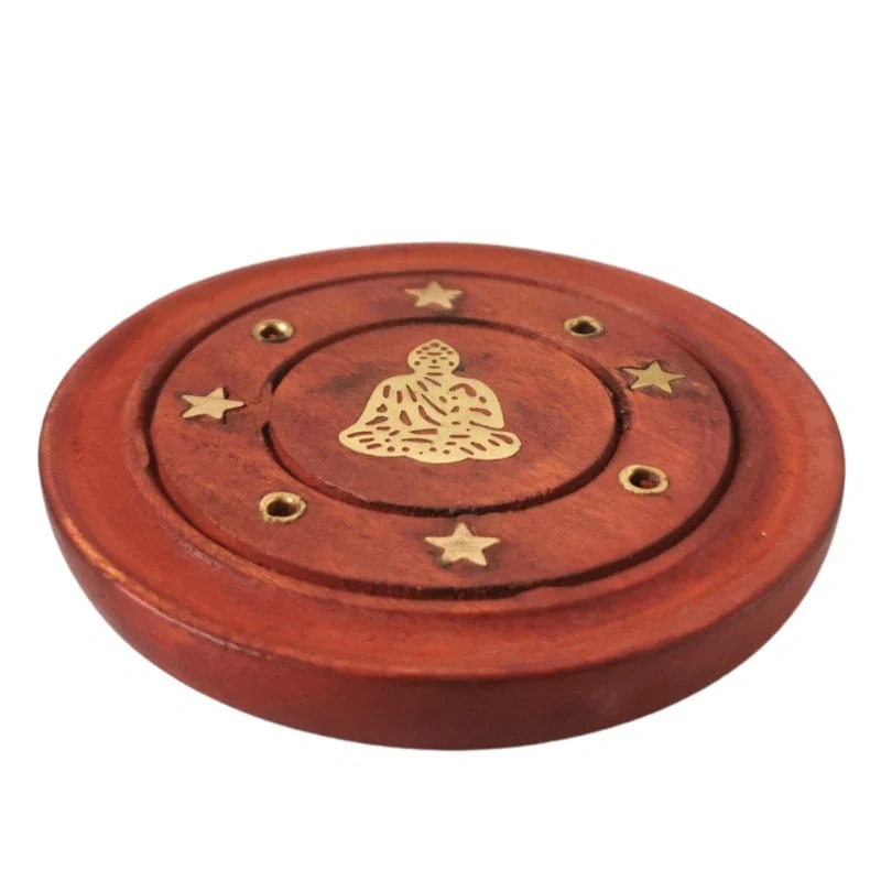 Okrągły stojak na kadzidła patyczki z motywem Buddy, wykonany z drewna mango.