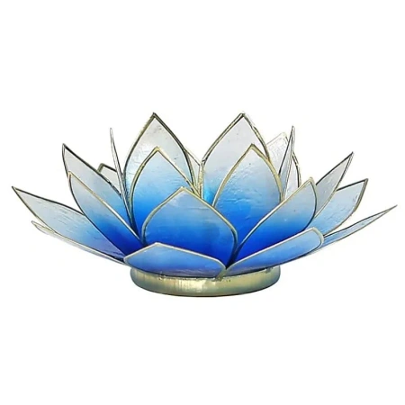- Świecznik w kształcie kwiatu lotosu w kolorze biało-niebieskim, wykonany z masy perłowej i wykończony mosiądzem.