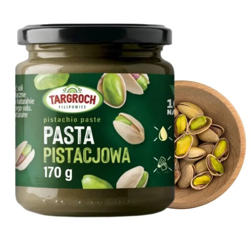 - Skład pasty pistacjowej: Pistacje łuskane prażone 100%. *W zakładzie pakowane są również: produkty zawierające gluten, orzeszki ziemne, soja, różne orzechy, sezam. Pomimo dołożenia wszelkich starań nie można w 100 % wykluczyć wystąpienia w produkcie tych surowców. *Olej na powierzchni produktu jest zjawiskiem naturalnym.