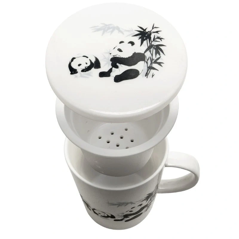 Kubek z zaparzaczem z motywem pandy. Z wygodnym uchem, świetny dla fanów herbaty liściastej i naparów ziołowych.