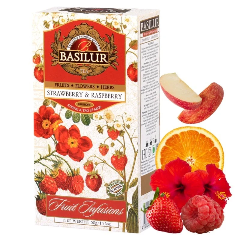 - Basilur Strawberry&Raspberry to owocowa herbata ekspresowa bez kofeiny. Aromatyczna mieszanka, która łączy w sobie naturalne składniki. Owoce, kwiaty i zioła tworzą orzeźwiający napar o intensywnym smaku i aromacie truskawki i maliny.