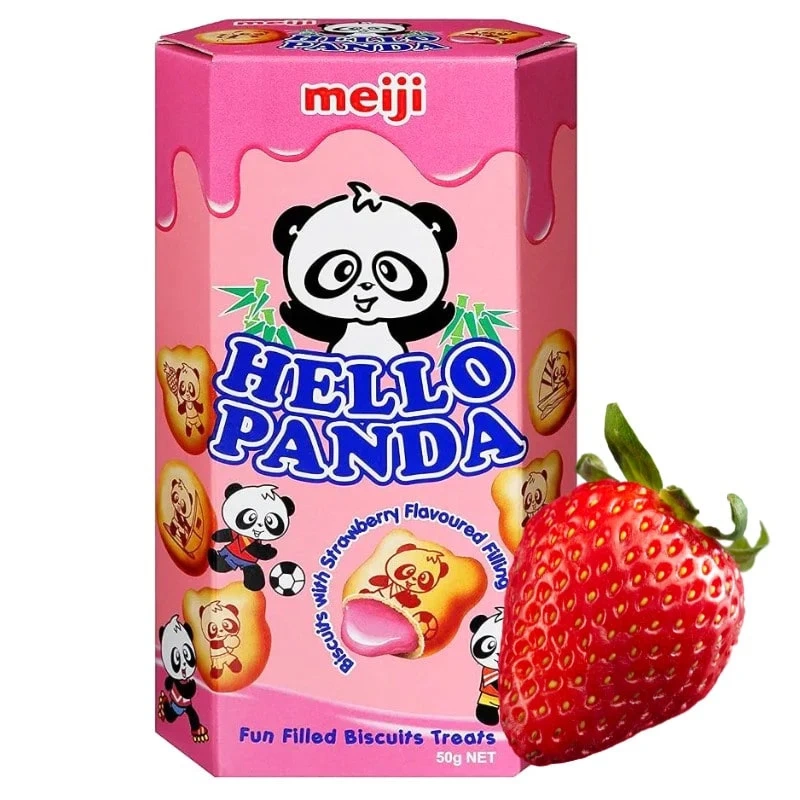- Chrupiące ciasteczka z nadzieniem o smaku truskawkowym Hello Panda Meiji to popularne japońskie słodycze, które łączą zabawny wygląd z pysznym smakiem. To idealna przekąska dla dzieci i dorosłych, która umili każdą chwilę.