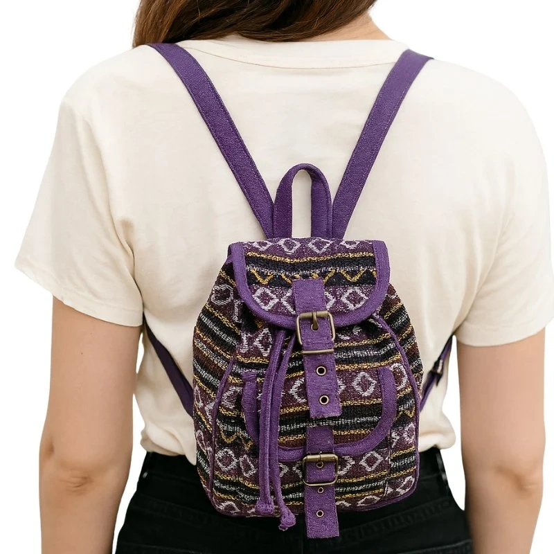 Mały plecak miejski damski i męski to idealne połączenie funkcjonalności i unikalnego designu, inspirowanego etnicznymi wzorami. Wykonany z bawełny gwarantuje trwałość i odporność na codzienne użytkowanie. Dominujące odcienie fioletu tworzą harmonijną kompozycję geometrycznych motywów, nadając mu wyjątkowy charakter.