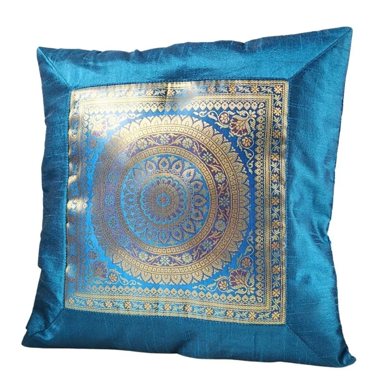 - Ozdobna poszewka na poduszkę wykonana z indyjskiej tkaniny w kolorze niebieskim.