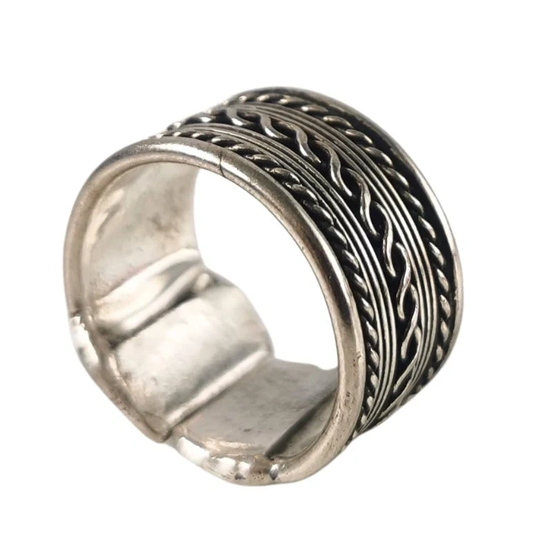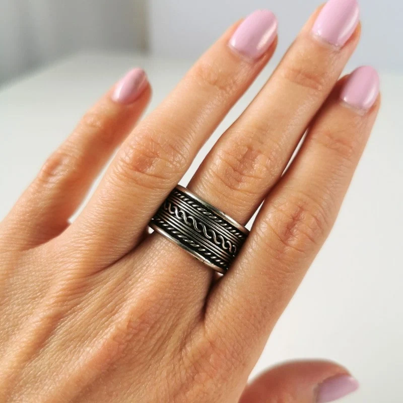 Pierścionek boho to masywna, srebrna obrączka, której design inspirowany jest estetyką orientalną. Jej główną cechą jest imponująca szerokość oraz zdobienie – powierzchnię pokrywają splecione wzory, które nadają całości autentyczny, rzemieślniczy charakter.