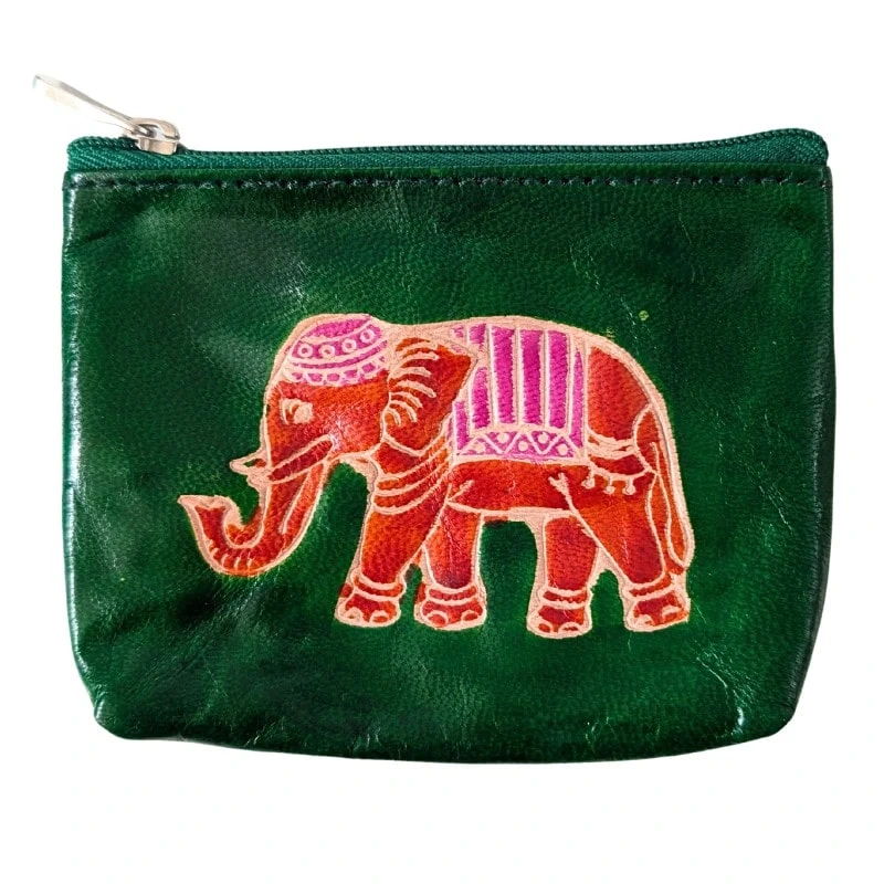 - Ręcznie robiona skórzana saszetka z Indii z kolorowym motywem słonia to praktyczny i oryginalny dodatek inspirowany kulturą Orientu. Idealna jako mały portfelik, etui na monety lub klucze.