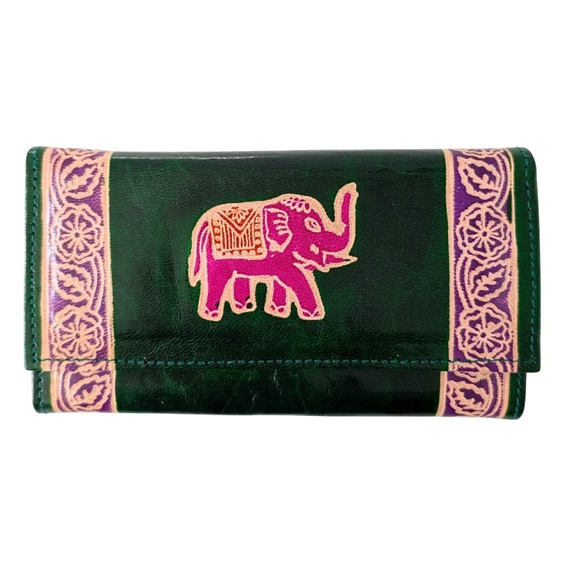 Skórzany portfel z przegródkami prosto z Indii z podobizną słonia. Portfel pięknie zdobiony orientalnymi wzorami.