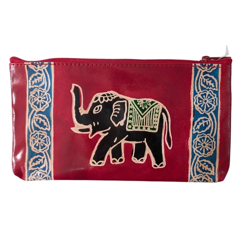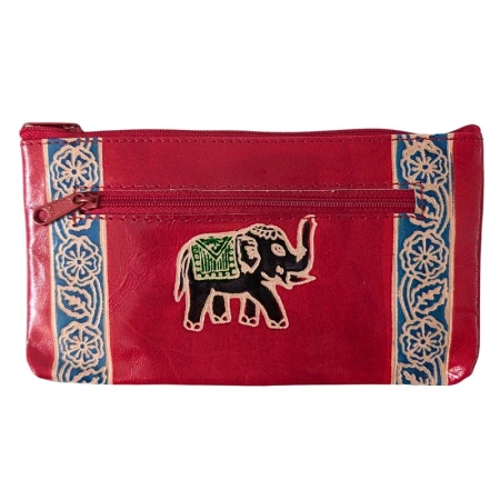 Skórzana saszetka ze słoniem, czerwona kosmetyczka, portfel